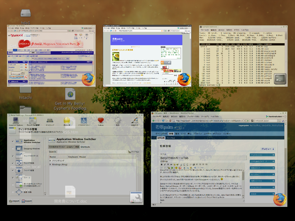 今日になって、そういえばFlip 3DはWinキーとTabをいっしょに押すと出てくるなあ、と思いながら、Berylで何の気無しにWinキーとTabを押してみてびっくり。Flip 3Dと同じような機能が動くじゃないか。Windows Vistaが左上から右下にかけてウィンドウが並ぶのに対して、Berylだと楕円状にウィンドウが並ぶ違いがあるが、ほとんど同じ機能だ。