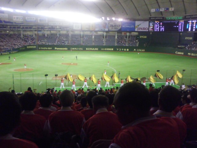 で8/29(金)は都市対抗野球大会の応援だ。会社の関係で、日立の某工場の人から誘われたのだ。都市対抗というのは初体験だが、都市対抗とは言っても各地の代表チームは大体は企業チームだから、もう会社の行事っていう感じがバリバリだ。入り口では日立の関連会社の人が長蛇の列を作っていたし、相手の名古屋代表 東邦ガスは東京ガスの人たちが応援に駆けつけるという感じ。入り口でHITACH Inspire the Nextのロゴ入りビブスと社歌が印刷された黄色いウチワを渡される。まわりはサラリーマンばっかって感じだが、ビブスでご覧のとおりの一体感がでる。試合開始前には日立つながりで、金メダルとったソフトボールの斉藤監督以下数名の選手も応援挨拶をしていた。(残念ながら上野とか峰はいなかった。)