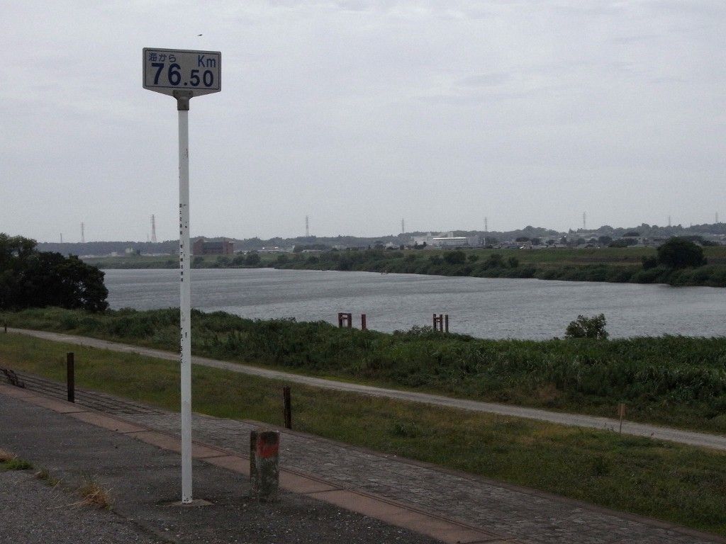 手賀沼から手賀川の北側を通って、少し道に迷いながらも布施で利根川の河川敷に出る。利根川の河川敷には、写真のような看板が。海から測ってもらっても、自転車の距離感だと、なんだか気が遠くなるんだけど。