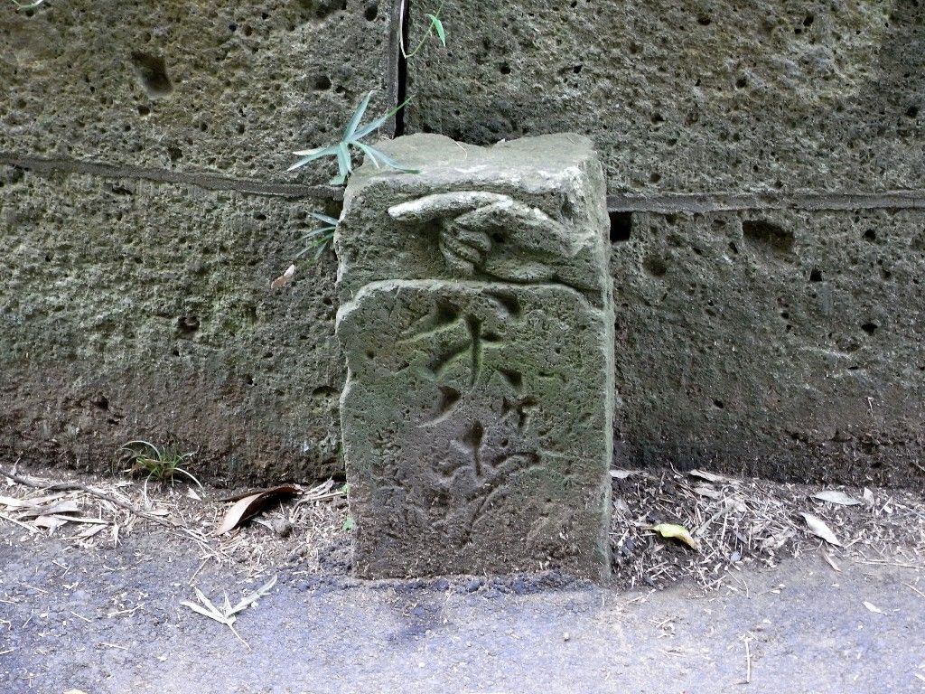まずは滝前不動尊に寄ってみる。ちょろちょろ水音がするので見ると、龍の口から水が滴り落ちている。これが名前の由来の滝のようだ。そこを離れて、坂道を奥に登っていくと、途中に右の写真のような小さな石碑があった。取手から我孫子、柏に分布する新四国相馬霊場八十八ヶ所の関係らしい。