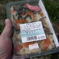 ようやく土手に登って昼食にした。沼南みちの駅で買った山菜おこわ。320円也。右上にあるショウガがピリピリしていて美味い。河川敷のゴルフ場の隣は、オフロードのバイクが練習していたり、模型飛行機の飛行場があったりだ。