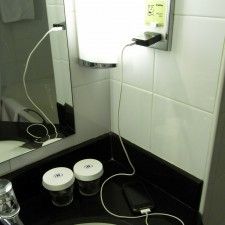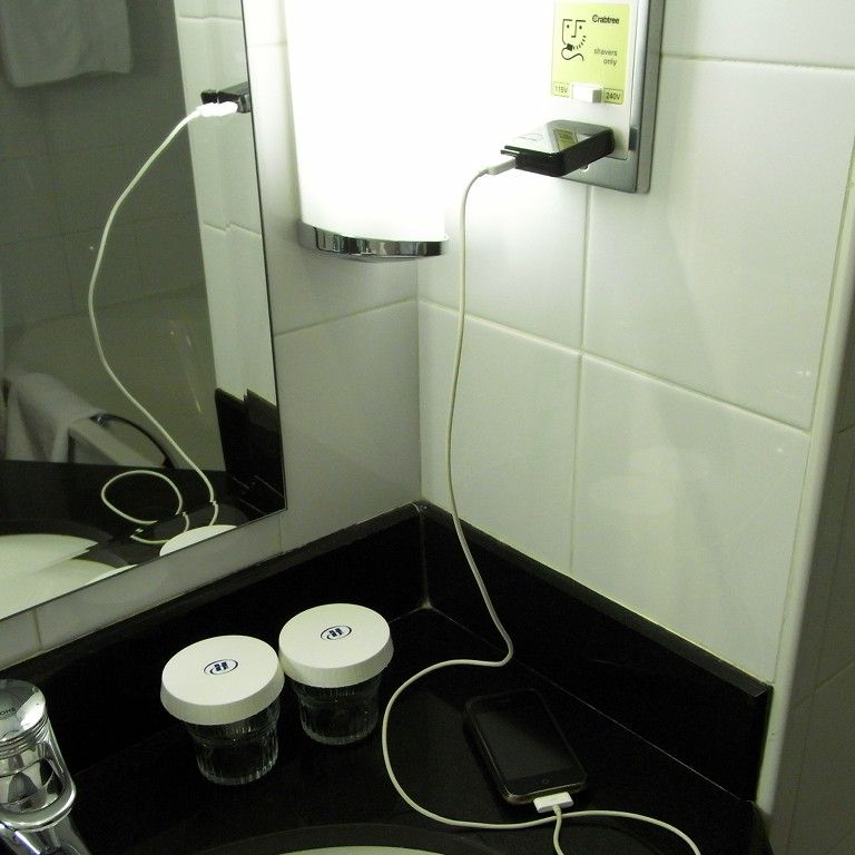 ここで今回の出張にもう一人同行していた、海外出張経験豊富な部長さんからアドバイス。洗面所に日本のコンセントが使えるシェーバー用の奴があるからそれを使うがよろしい、と。それでiPhoneの充電が出来て、とりあえずは一安心だった。今回は携帯電話もiPhoneのローミングでまかなうつもりだったので、電池切れはやばい。ネットは海外パケ放題でしのぐ。