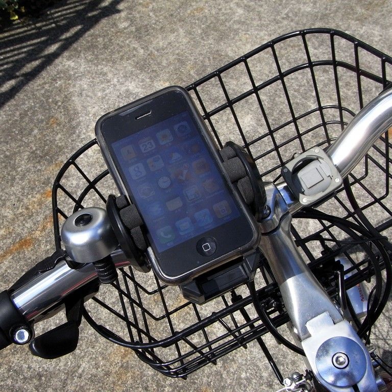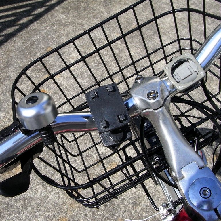 土曜の朝、遠乗りに出かける前に装着。ハンドルに取り付ける部分は丸い輪っかをネジ止めして、その上にホルダー部をハメこむ構造だ。