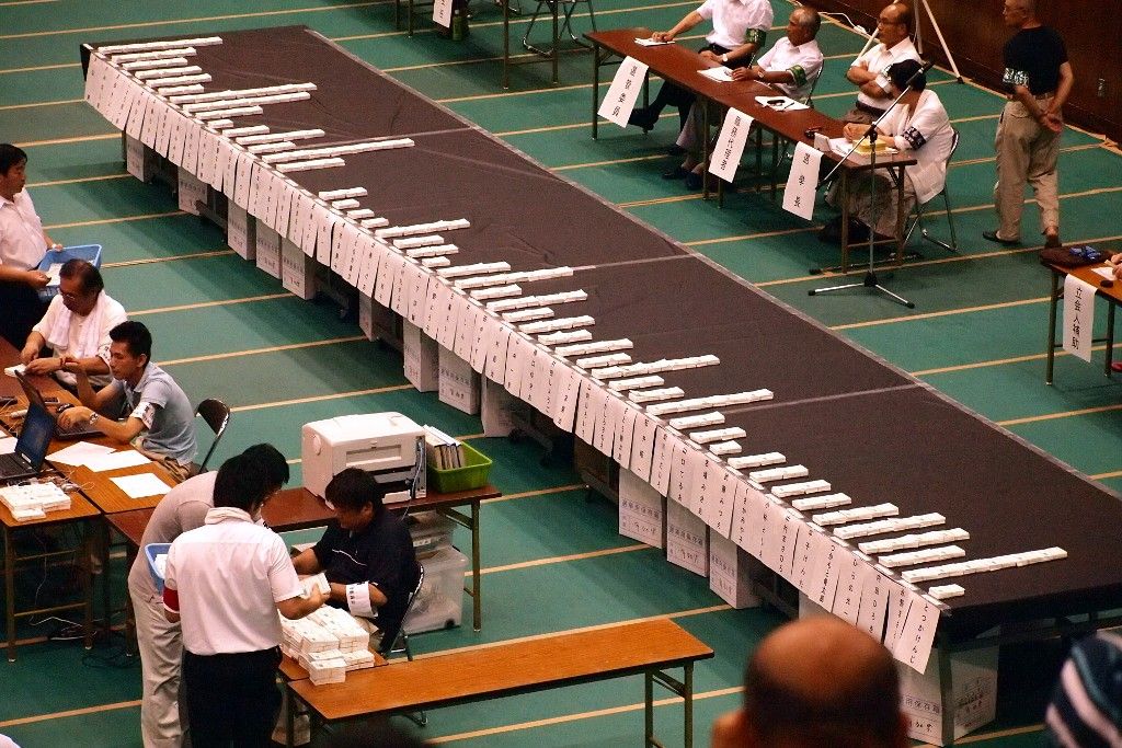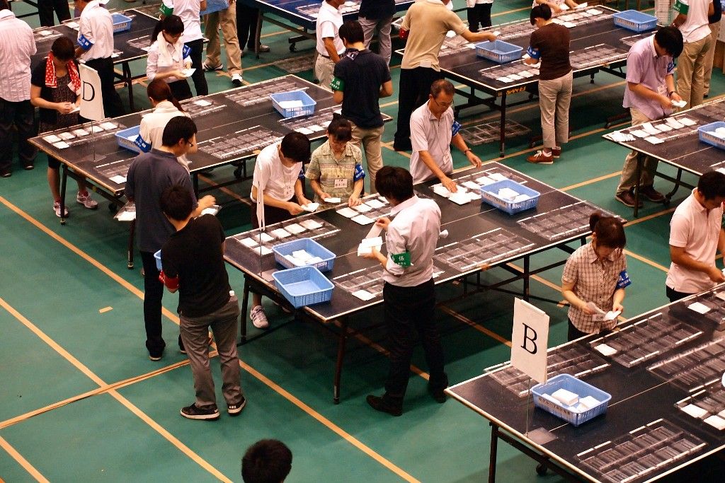 到着したときにはすでに開票作業が始まってしまっていた。写真右上の青い柵で囲われているエリアは、票を取り出した投票箱を片付けているところだ。前に衆議院議員選挙の開票を見に来たことがあったが、その時とは机のレイアウトが違う。
