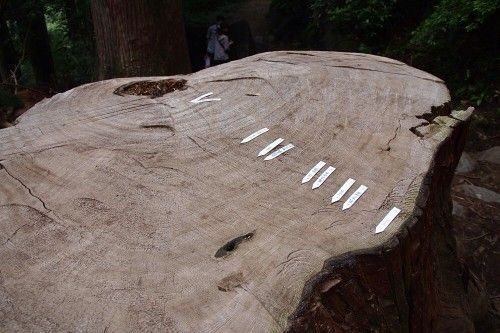去年だったかの台風で倒れたと思われる木の切り株に、年輪を数えたマークがしてある。一番内側に1700と書いてあるので、この木は樹齢300年以上ってことになる。