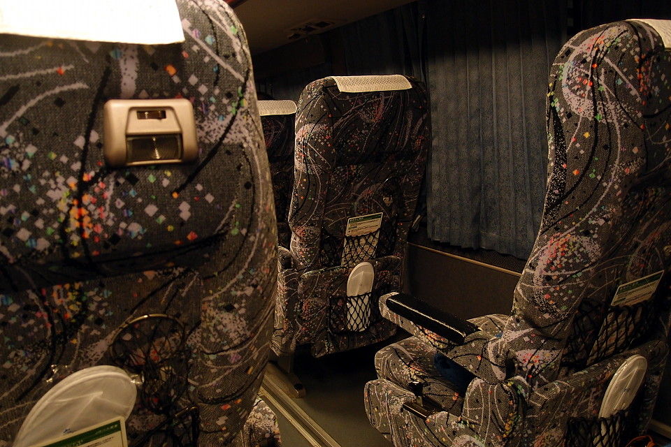 ドリーム号は3列シート仕様のやつで、シートはこんな様子。3列と言っても、実際には2列+1列みたいな感じで、予約がとれた真ん中の席は2人掛けの通路側に相当する。早割、ネット割を効かせて7,640円也。